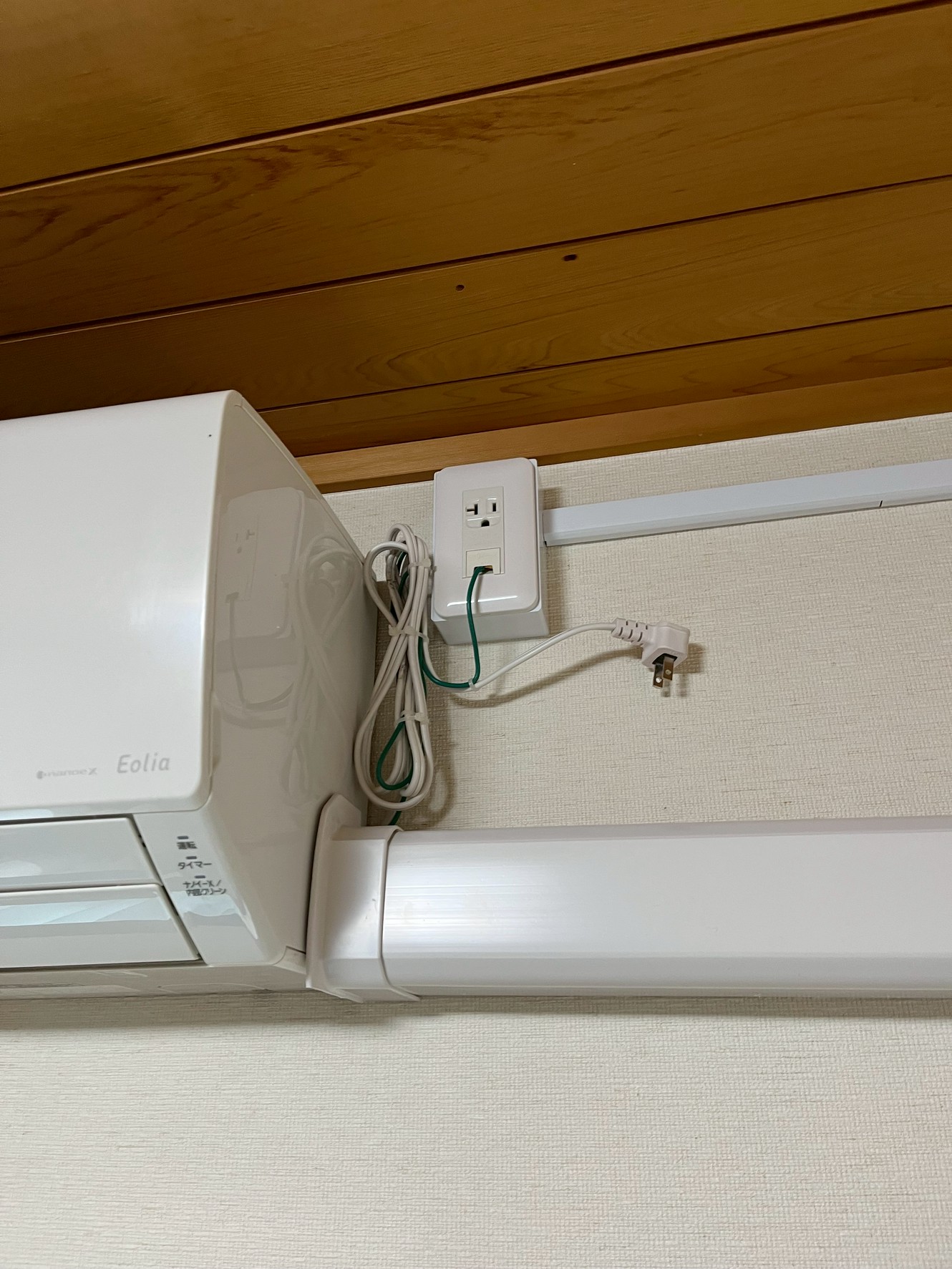 もともと近くにコンセントがあったのですが、エアコン専用の回路を分電盤から引いたほうが安心ということで、そちらをご提案させていただきました。お客様にも納得いただき、専用コンセントを新設し、あわせてエアコンの取り付けも行いました。