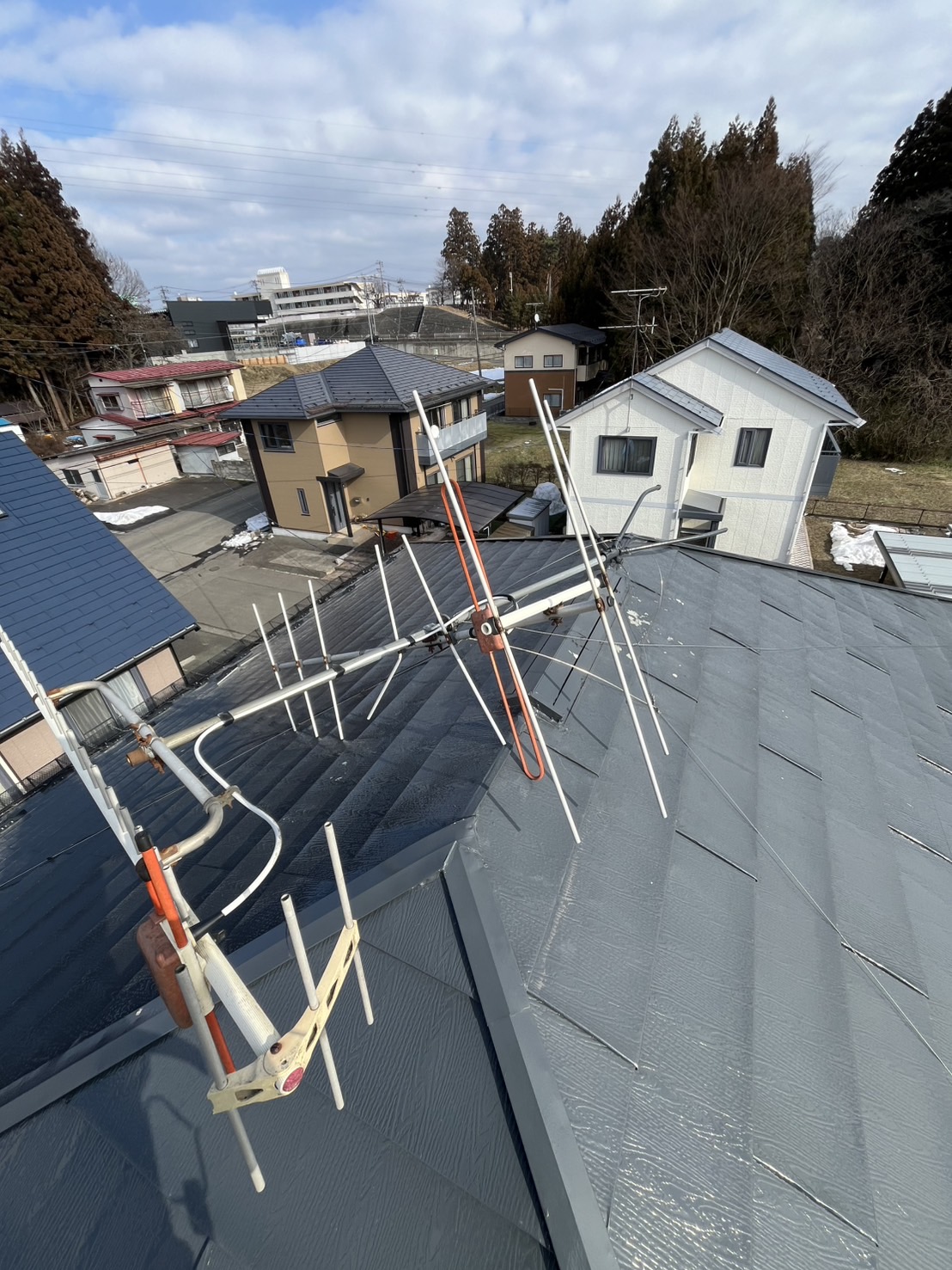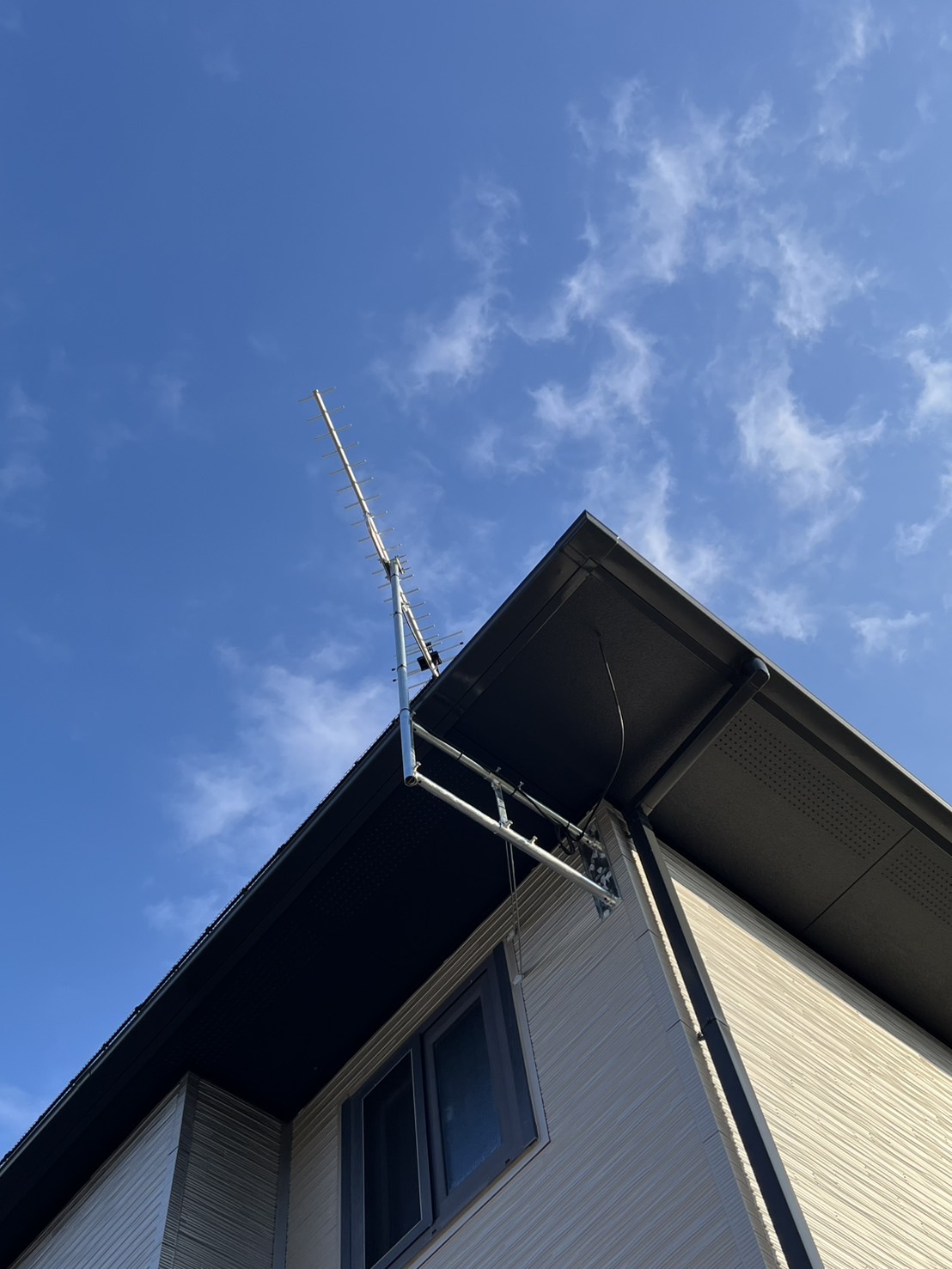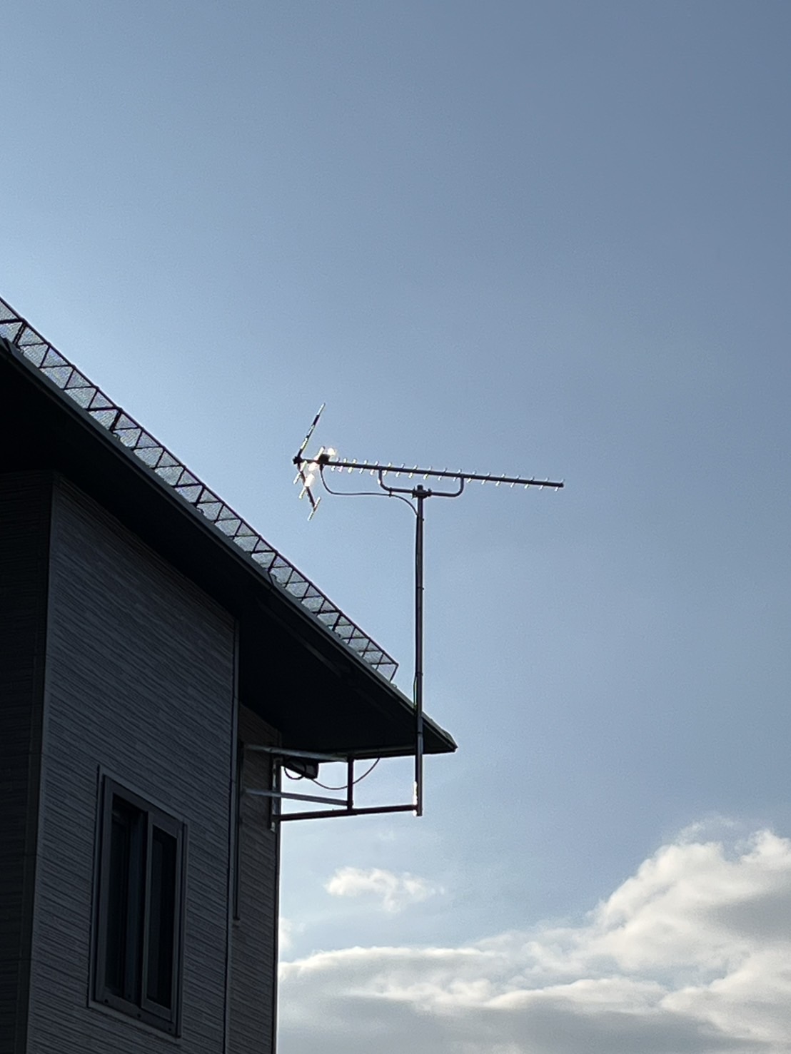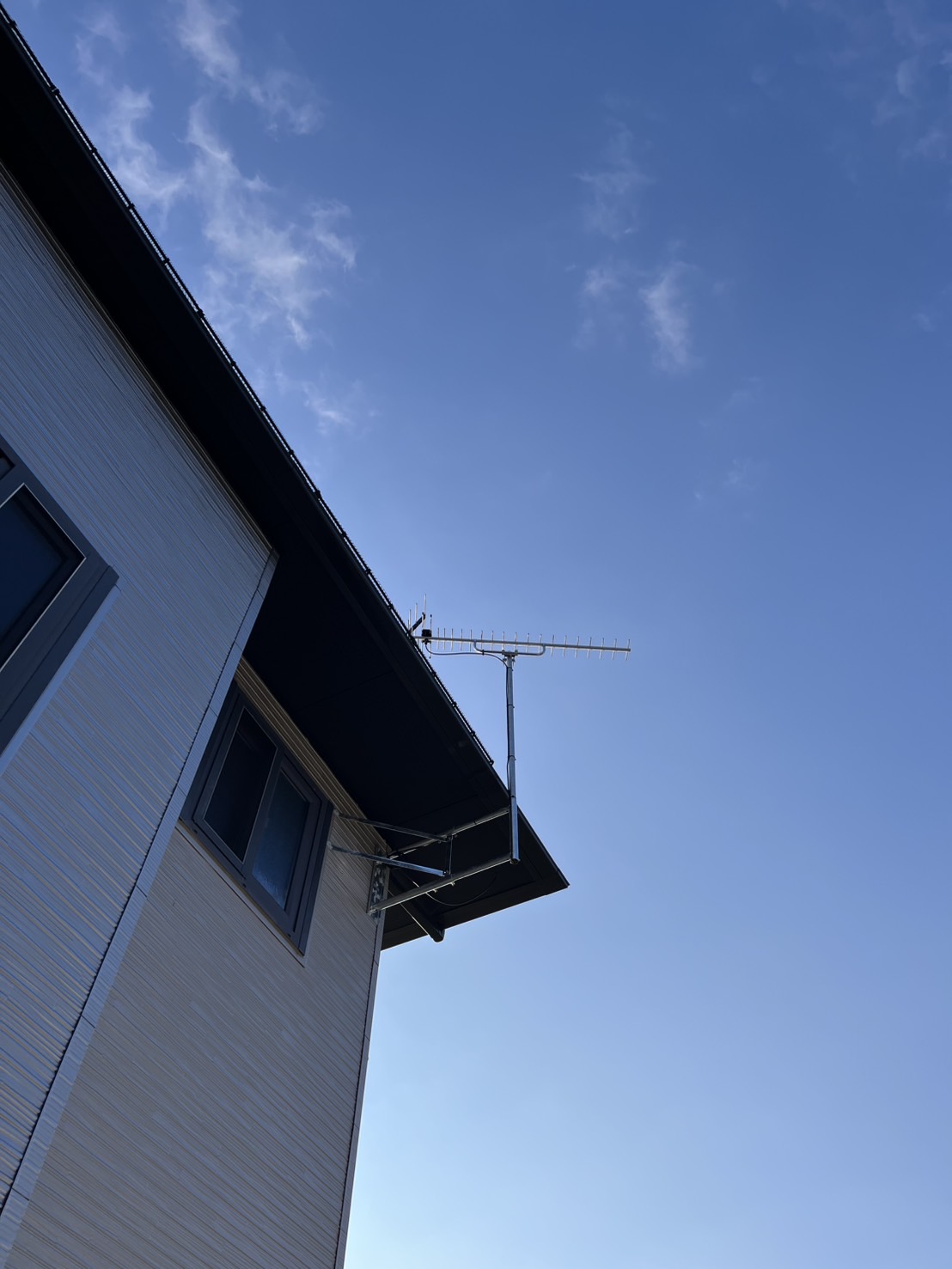 屋根上に設置されていたテレビアンテナを、外壁への壁付にする工事を行いました。屋根上のアンテナは風や雪の影響を受けやすく、メンテナンス時の危険もあります。今回屋根の上で一人でツルっといき久々にヒヤッとしました。アンテナは外観を損なわない位置を選定し、強度・受信感度ともに十分に確保した上で壁面位置に設置。このアンテナがなかなかの重量。コツコツとジムで鍛えていた甲斐がありました。