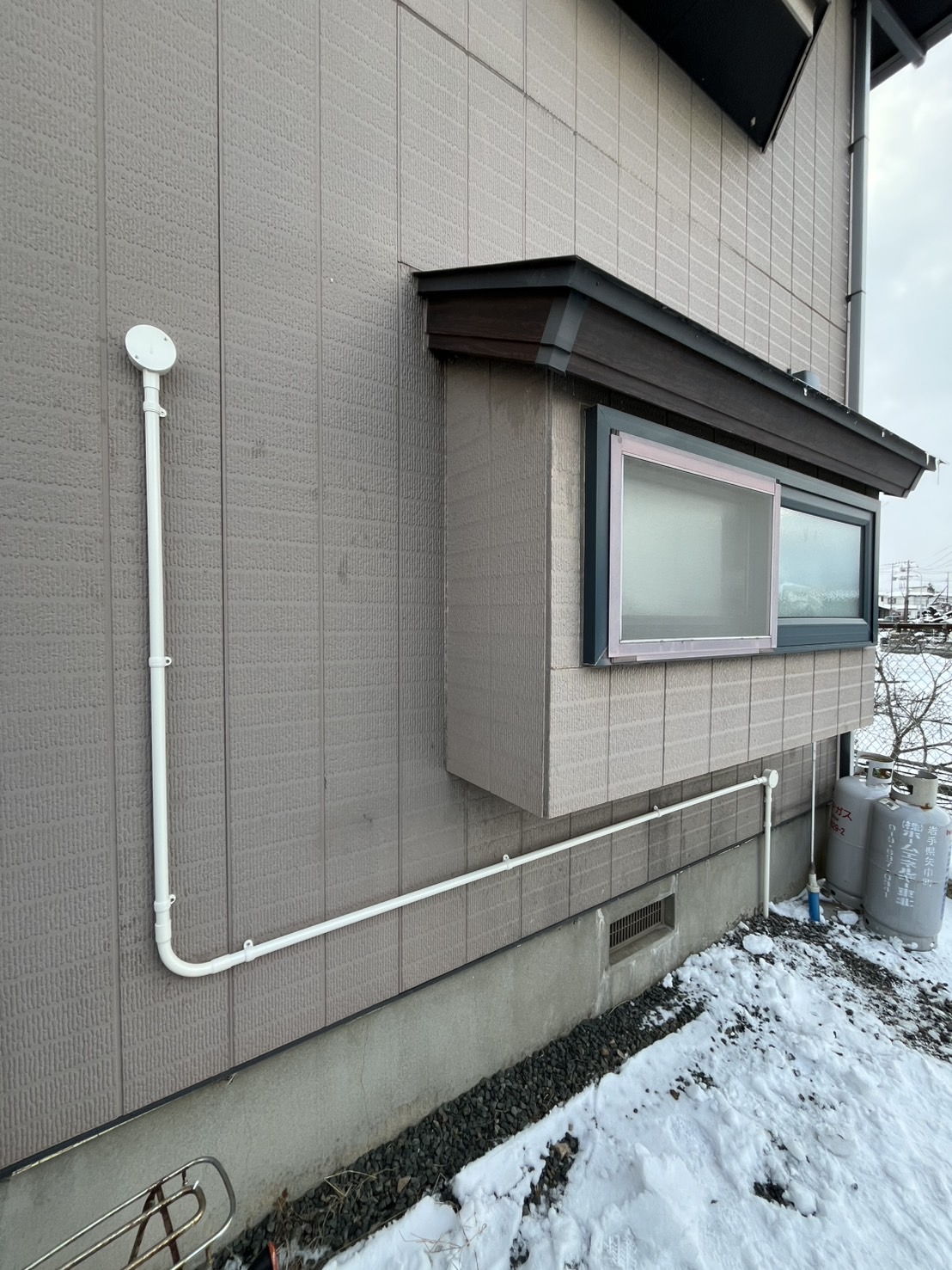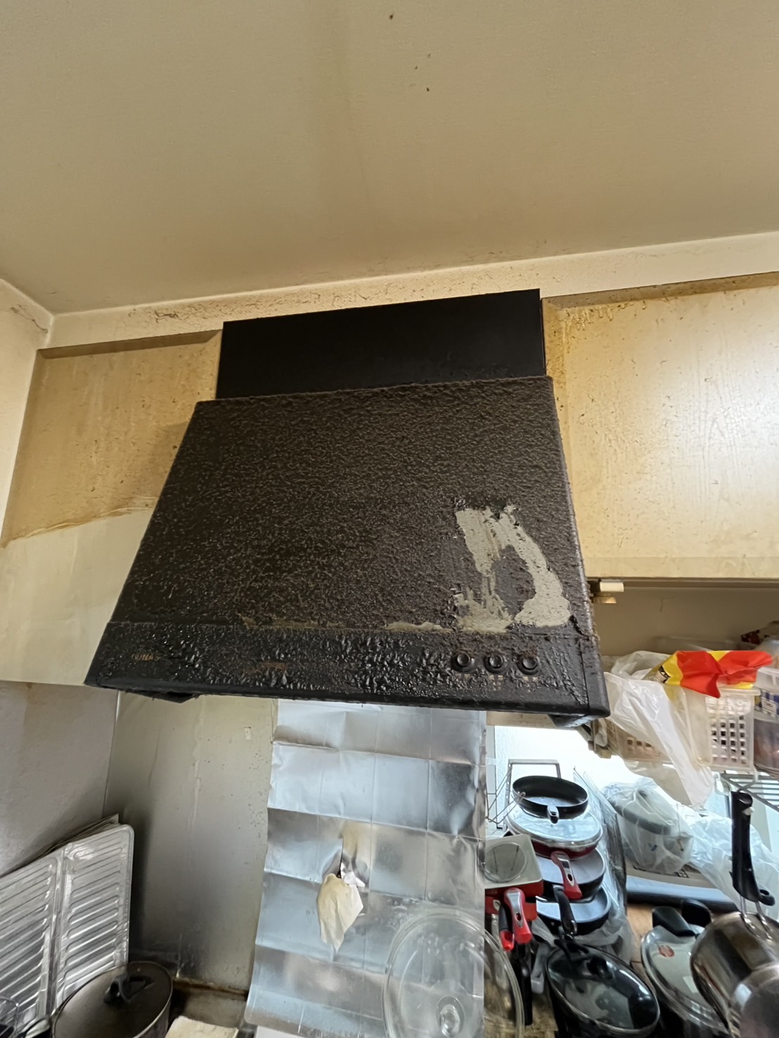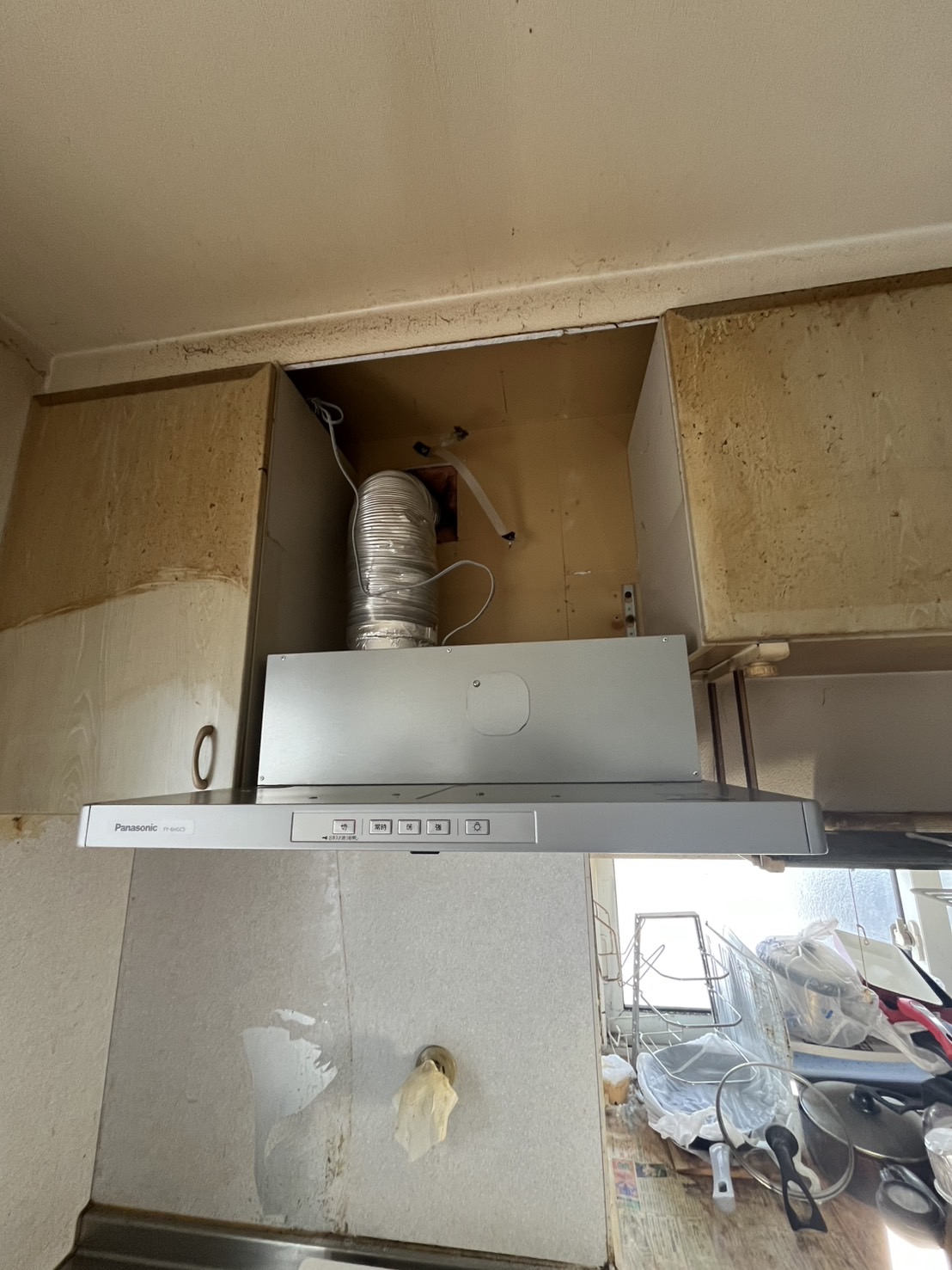 今回は、古くなったレンジフードの交換工事を行いました。長年使用されているレンジフードは、モーターの劣化などにより吸い込みが弱くなったり、音が大きくなることがあります。既存のレンジフードを取り外し、取付部分の状態を確認しながら作業を進めました。新しいレンジフードは以前のレンジフードに比べ吸引力が高く、お手入れもしやすくなっています。新しいレンジフード、スマートでかっこいいです。外壁の配線も丁寧に施工しました。